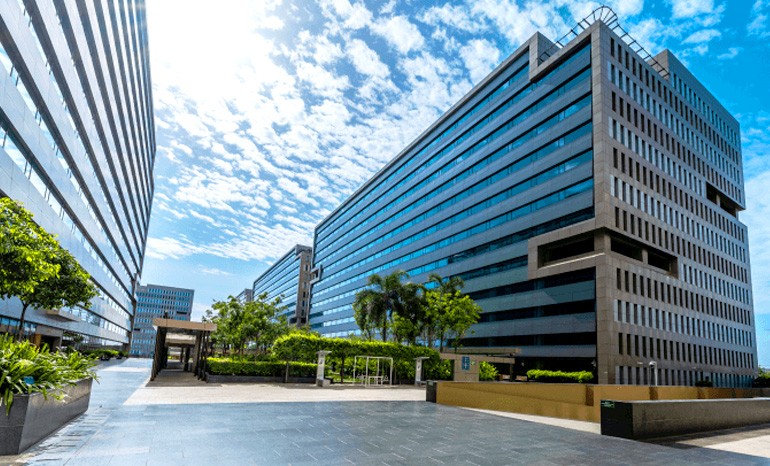 Ramanujan IT City (Intellion Park) is one of the most successful IT SEZ development located in the heart of Chennai’s southern business district, Taramani, spread over 25.27 acres. The processing zone has 5.7 million sq.ft. of office space with 2 ½ acres of lush greenery, landscaped podiums with informal seating, a Zen garden and covered walkways connecting all towers. This tech park offers a world-class contemporary structure, equipped with amenities like a Food Court, ATMs and much more. The project has obtained LEED Platinum Green Building certification (as per LEED Gold Guidelines—Pre-certified) and IMS certification. The property offers spacious and skilfully designed commercial office space with excellent in-house parking space. The buildings are being built in 6 blocks with 14 floors, five levels of car parking, including three levels of basement car parking, along with additional multi-level car parking. Each floor has floor-plates ranging from 50,000 sq.ft. to 1,00,000 sq.ft. in various blocks. The towers are named Hardy Tower, Carr Tower, Neville Tower, Cambridge Tower, Littlewood Tower and Infinity Tower in the memories of G. H. Hardy, G.S.Carr, Eric Harold Neville and John Edensor Littlewood respectively. Utility buildings are also being constructed to support the IT facilities. This SEZ campus is developed by TATA Realty and Infrastructure Limited, Indian Hotels Company Limited (IHCL) and Tamil Nadu Industrial Development Corporation (TIDCO).Situated next to TIDEL park on Old Mahabalipuram Road, it is surrounded by IT parks, railway station, transport hubs, and day-care centers. Carr Tower with a total built-up area of 9,00,000 sq.ft., the 14-floor block has a floor plate size of ~60,000 sq.ft. It is occupied by Qualcomm India.