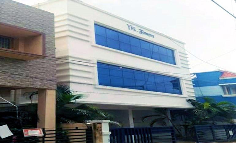 The building is located in the Secondary Business District, Alandur. It has a total built-up area of 10,500 sq.ft. across 3 floors and stilt parking, with a typical floor area of 3,500 sq.ft. It is surrounded by eateries, metro station, and bus hubs. It is occupied by Prowess Publishing and Software Solutions Pvt. Ltd.